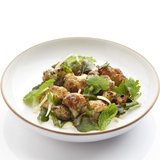 Grilled cauliflower topped with Chinese spices and accompanied by crispy curry leaves.